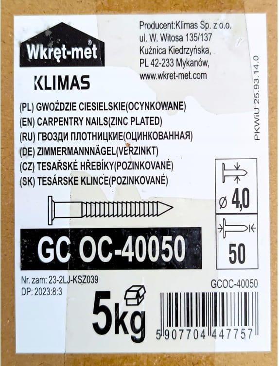 ➡️ Średnica i długość gwoździa dw x Lw [mm]: 4 x 50