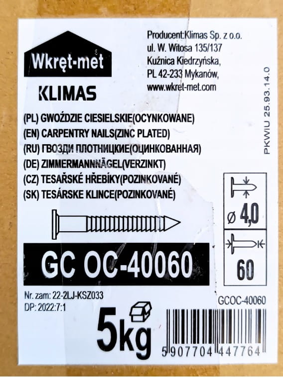 ➡️ Średnica i długość gwoździa dw x Lw [mm]: 4 x 60