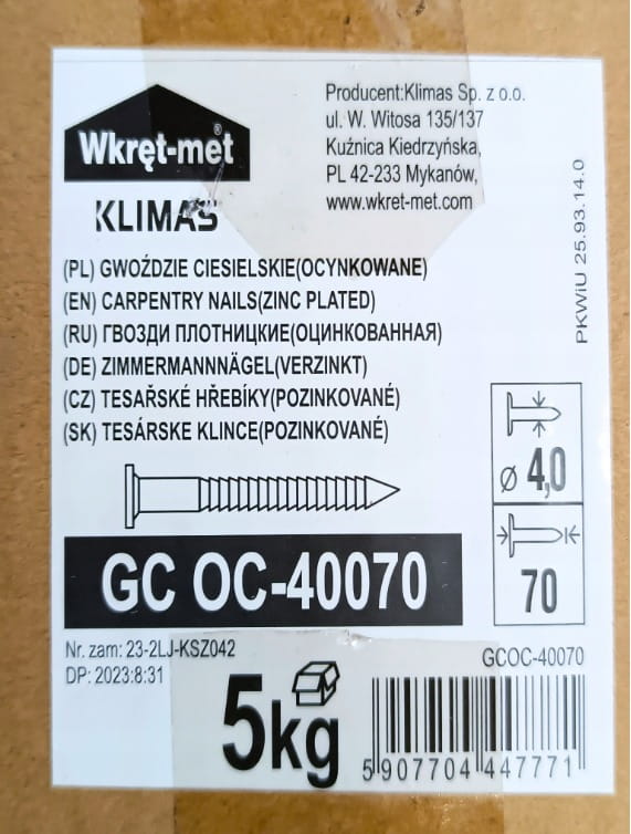 ➡️ Średnica i długość gwoździa dw x Lw [mm]: 4 x 70