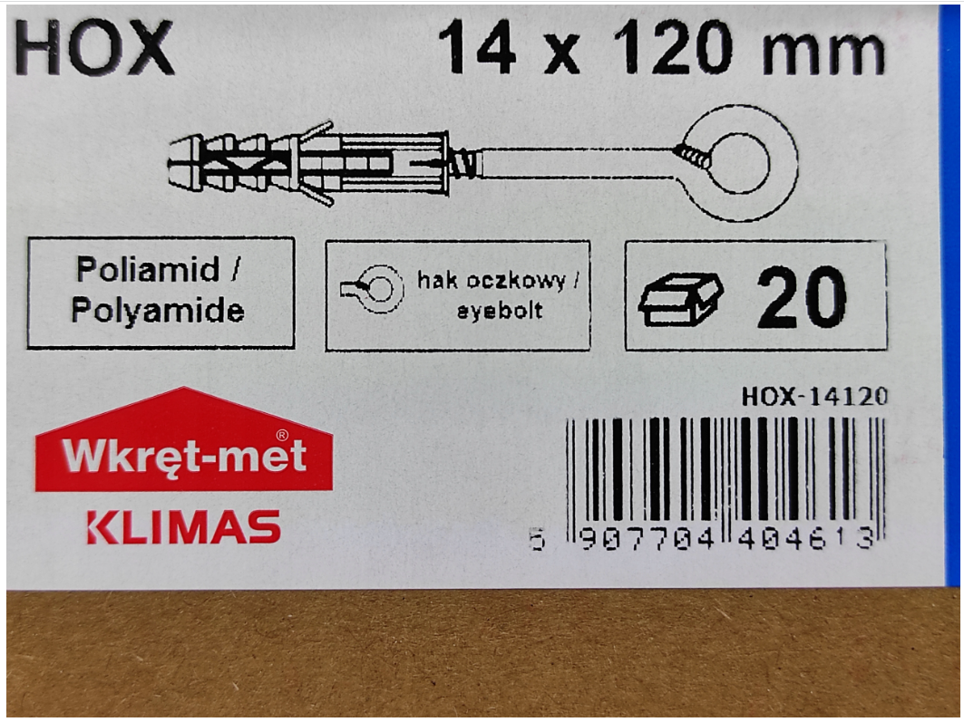 Kołek rozporowy z hakiem oczkowym HOX, o dużej średnicy oczka (25mm). Kołek ten jest bardzo wytrzymały ponieważ hak wygięty jest z jednego kawałka drutu. Podłoża do jakich kołek HOX może być instalowany to beton, cegła ceramiczna pełna, cegła silikatowa pełna. Jego głównym przeznaczeniem jest to mocowanie rusztowań budowlanych do budynku.