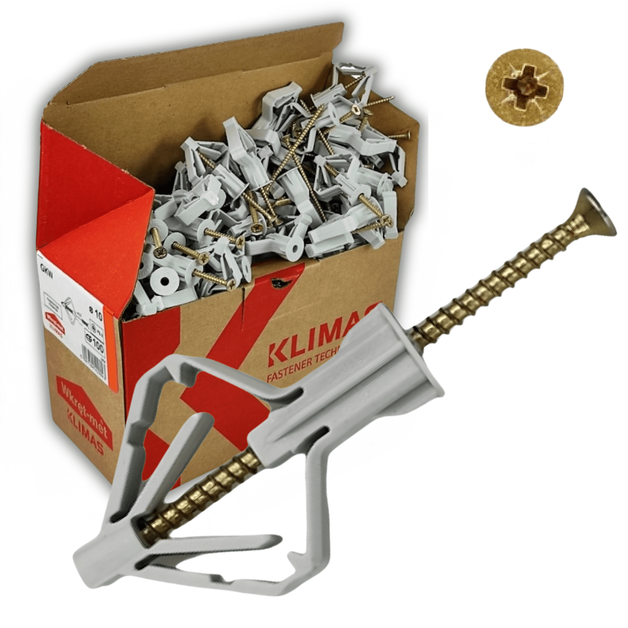 Kołek GKW marki Wkręt-met składa się z koszulki tworzywowej wykonanej z poliamidu oraz wkręta wykonanego ze stali ocynkowanej z łbem stożkowym, który gwarantuje pewny docisk mocowanego elementu.