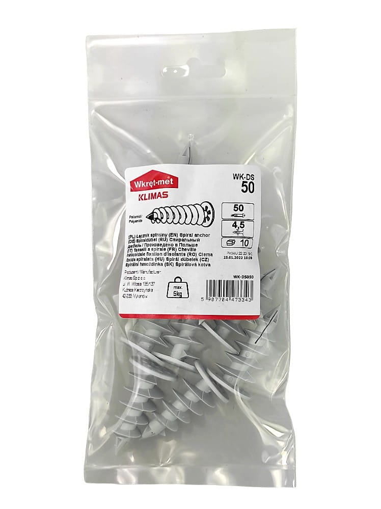 WK-DS kołki spiralne tworzywowe do montażu w styropianie służą do mocowania lekkich elementów niekonstrukcyjnych, czyli z wagą maksymalną do 5 kg., do elewacji ścian wykonanych ze styropianu. Przykładem takich elementów mogą być: numery domów, skrzynki na listy, szyldy, czujniki, elementy oświetlenia.