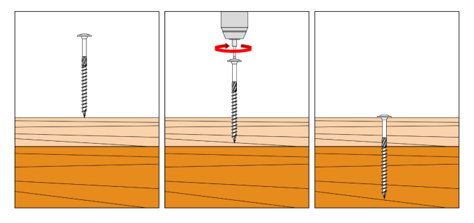 4. Wkręty należy wkręcać bezpośrednio do podłoża drewnianego bez wcześniejszego wywiercenia otworów lub w otworach nawierconych co zmniejsza ryzyko pękania drobnych elementów.