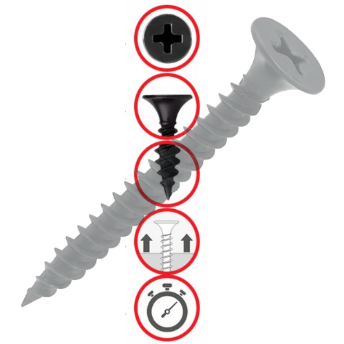 ✅ Krótki czas wkręcania - Specjalny profil gwintu minimalizujący czas wkręcenia: 2,5 razy krótszy czas wkręcania od wymagań normy