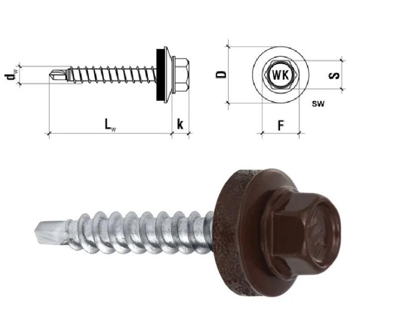 Wkręt samowiercący marki Wkręt-met z podkładką EPDM wykonany w powłoce cynkowej do mocowania blach, blachodachówki i obróbek blacharskich do podłoża drewnianego.