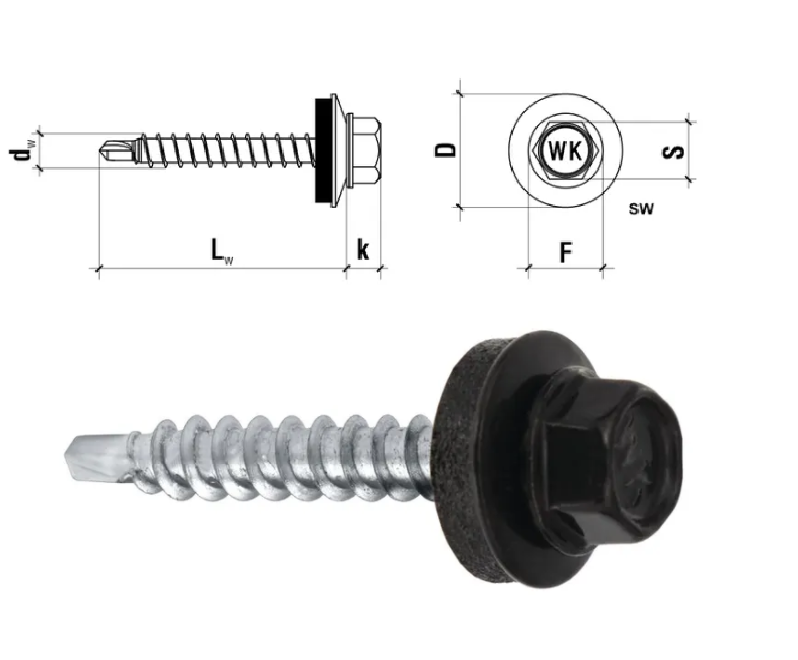 Wkręt samowiercący marki Wkręt-met z podkładką EPDM wykonany w powłoce cynkowej do mocowania blach, blachodachówki i obróbek blacharskich do podłoża drewnianego.