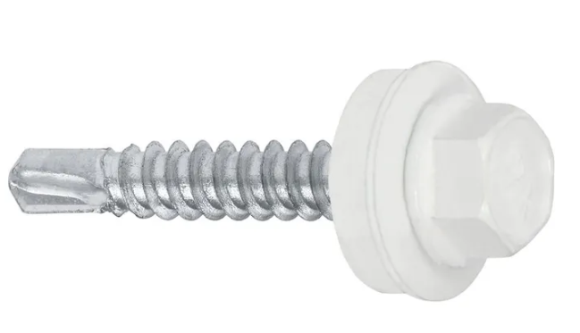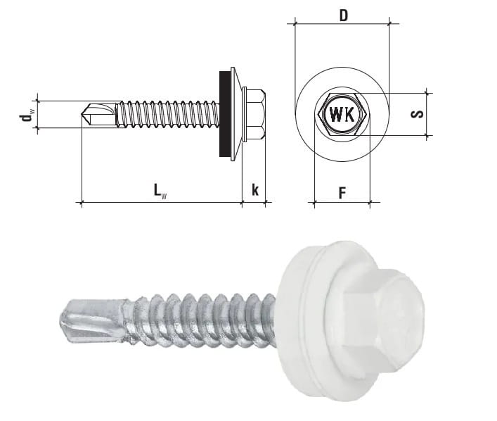 Wkręt posiada łeb sześciokątny typu SW, zapewniający pewny chwyt klucza i wygodne dokręcanie, a także gwint przeznaczony do stali, który gwarantuje solidne osadzenie w materiale. Ostrze w kształcie wiertła umożliwia wiercenie i wkręcanie w jednym etapie, bez konieczności wcześniejszego nawiercania otworu. Dodatkowo podkładka z uszczelką EPDM chroni miejsce łączenia przed wilgocią, zapewniając pełną szczelność i odporność na warunki atmosferyczne.