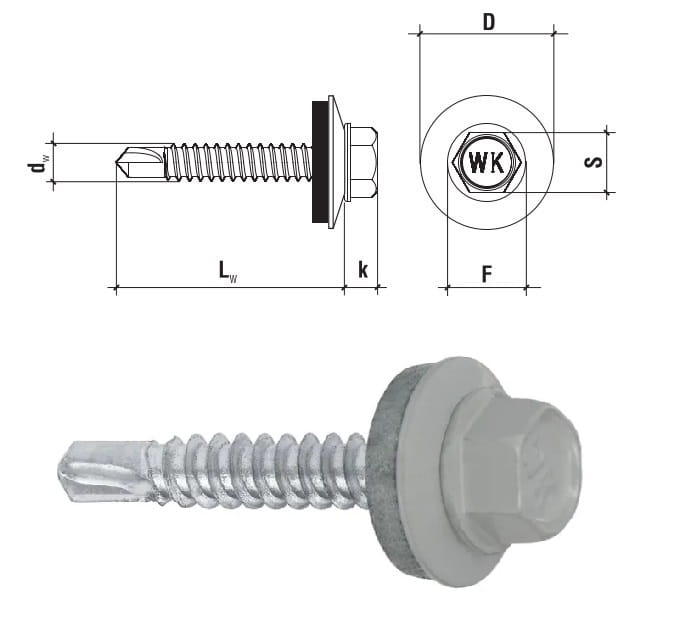 Wkręt posiada łeb sześciokątny typu SW, zapewniający pewny chwyt klucza i wygodne dokręcanie, a także gwint przeznaczony do stali, który gwarantuje solidne osadzenie w materiale. Ostrze w kształcie wiertła umożliwia wiercenie i wkręcanie w jednym etapie, bez konieczności wcześniejszego nawiercania otworu. Dodatkowo podkładka z uszczelką EPDM chroni miejsce łączenia przed wilgocią, zapewniając pełną szczelność i odporność na warunki atmosferyczne.