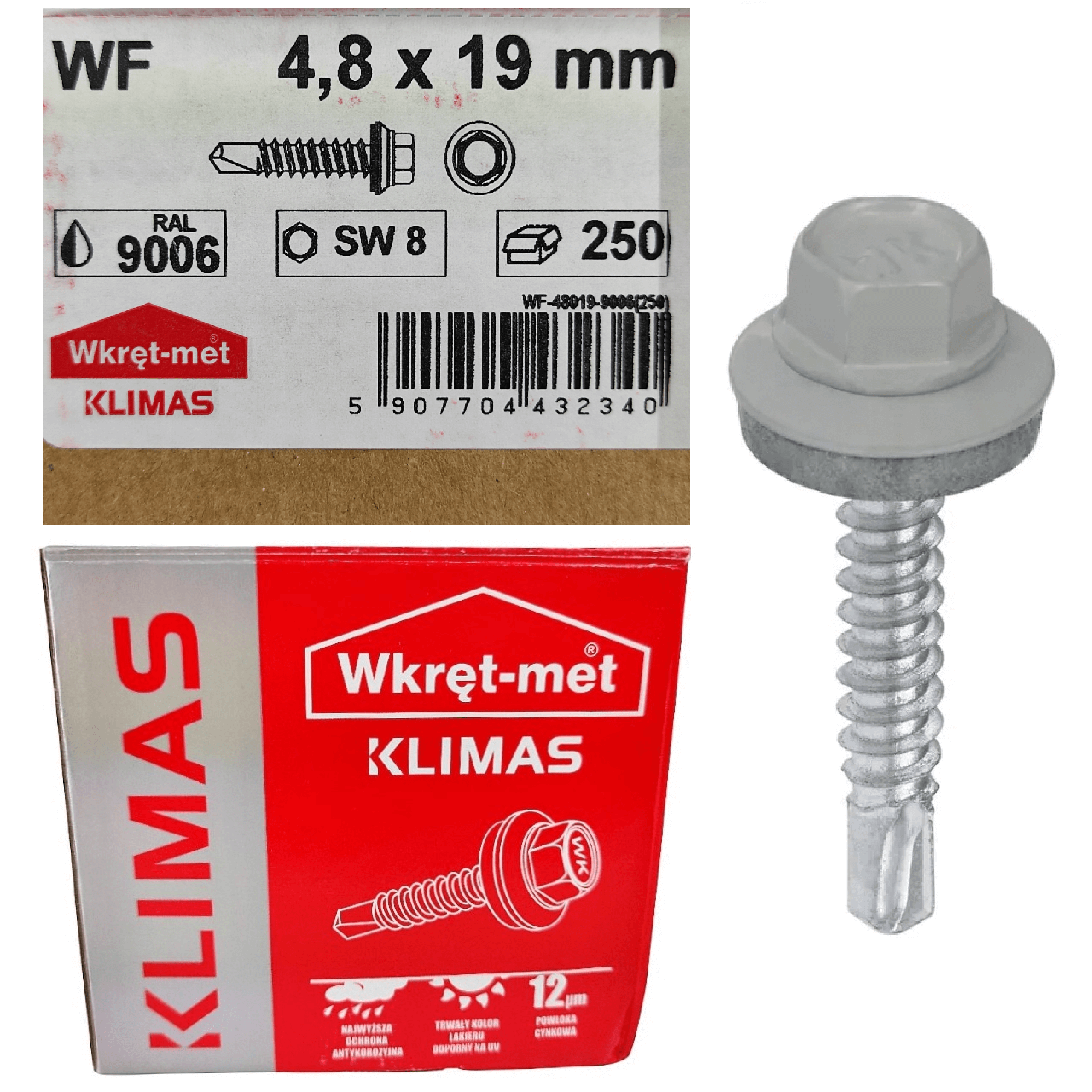 Wkręt samowiercący WF-4,8 marki Wkręt-met KLIMAS to wysokiej jakości wkręt do metalu, wykonany z hartowanej stali węglowej pokrytej powłoką cynkową o grubości 12 µm, która skutecznie zabezpiecza przed korozją. Produkt został zaprojektowany z myślą o mocowaniu blach, profili stalowych i elementów konstrukcyjnych, gwarantując trwałe i szczelne połączenie.