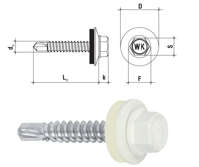 Wkręt posiada łeb sześciokątny typu SW, zapewniający pewny chwyt klucza i wygodne dokręcanie, a także gwint przeznaczony do stali, który gwarantuje solidne osadzenie w materiale. Ostrze w kształcie wiertła umożliwia wiercenie i wkręcanie w jednym etapie, bez konieczności wcześniejszego nawiercania otworu. Dodatkowo podkładka z uszczelką EPDM chroni miejsce łączenia przed wilgocią, zapewniając pełną szczelność i odporność na warunki atmosferyczne.